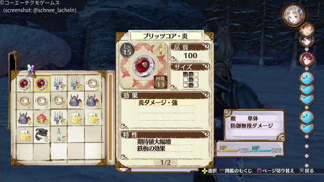 乱数の影響を避けるため、特性は「期待値大幅増」「鉄板の効果」を付けます。また戦闘中のアイテム選択画面で「防御無視ダメージ」と表示されるものをなるべく選びましょう。そうでないものは、たとえ「期待値大幅増」「鉄板の効果」を付けていても、ダメージが乱数でブレることがあります。
