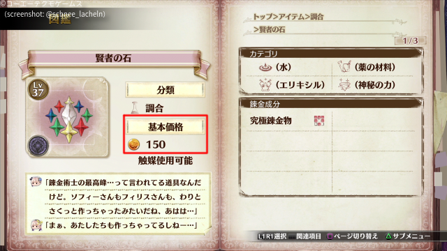「リディー&スールのアトリエ」のアイテム図鑑には、各アイテムごとに「基本価格」という値が掲載されています。